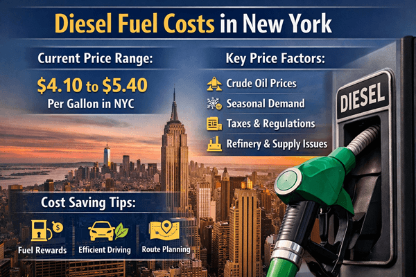 New York diesel prices include federal, state, and local fuel taxes, which add roughly $0.75 to $0.90 per gallon to the base fuel cost. Prices tend to rise during winter due to heating oil demand and during summer travel seasons. Savings are often found by fueling in outer boroughs, using membership warehouse stations, paying with cash instead of credit, and filling up early in the week when prices are sometimes lower.
